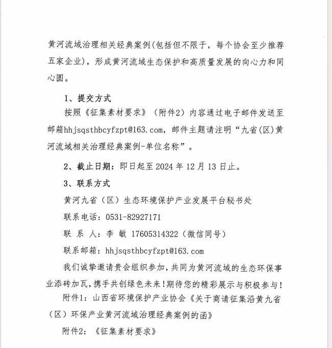 为深入贯彻落实习近平总书记关于黄河流域生态保护和高质量发展的系列重要讲话精神,加强黄河流域生态环境保护,推进水资源节约集约利用,推动环保产业高质量发展。助力黄河流域生态环保新技术、新装备、新工艺等的推广和示范作用。山西省环境保护产业协会第四期《山西环保产业》将专刊宣传沿黄九省(区)生态环境保护产业发展平台的相关内容,其中有一项内容为:联动黄河流域九省(区),运用数据化的方式宣传推广九省(区)黄河流域相关治理经典案例,以期发挥其良好示范效应。现面向会员单位征集黄河流域治理相关经典案例,相关事宜如下:按照《征集素材要求》内容通过电子邮件发送至邮箱sdshbcyxh@163.com,邮件主题请注明“九省(区)黄河流域相关治理经典案例-单位名称”。2.2高清版本企业标志标识,需提交Adobe Illustrator矢量软件支持的.ai或.eps格式。2.5经典案例展示(优先选择黄河流域治理经典案例(包括但不限于),并提供文字描述及图片。2.6企业优势、奖励、专利数量、合作伙伴等内容及图片。2.7企业宣传片视频、企业宣传册电子版(PDF格式)。2.8具有艺术感的企业产品或服务场景高清摄影作品。